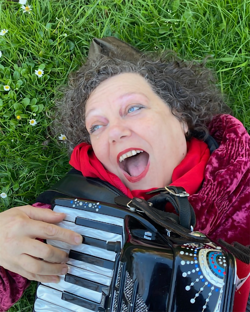 Jeanette Lewicki, who lives in San Francisco, is a long-time singer of Yiddish songs as well as an accordionist, artist, writer, and klezmer musician. She leads her own band “the gonifs” and she loves to teach. Jeanette first picked up the accordion in the vegan commune where she started living at the age of 28.